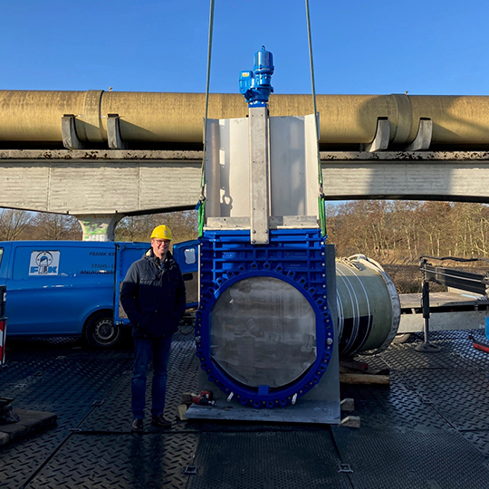 ZETA® DN 1200 avec entraînements DREHMO. Celles-ci ont été installées dans le pont tubulaire en novembre 2024 - comme la canalisation d’eaux usées se trouve dans une zone de protection ornithologique, les travaux ne peuvent en effet y avoir lieu qu’en hiver. Les vannes-guillotines sont utilisées ici comme organes de sécurité afin de pouvoir interrompre les canalisations dans les deux sens.